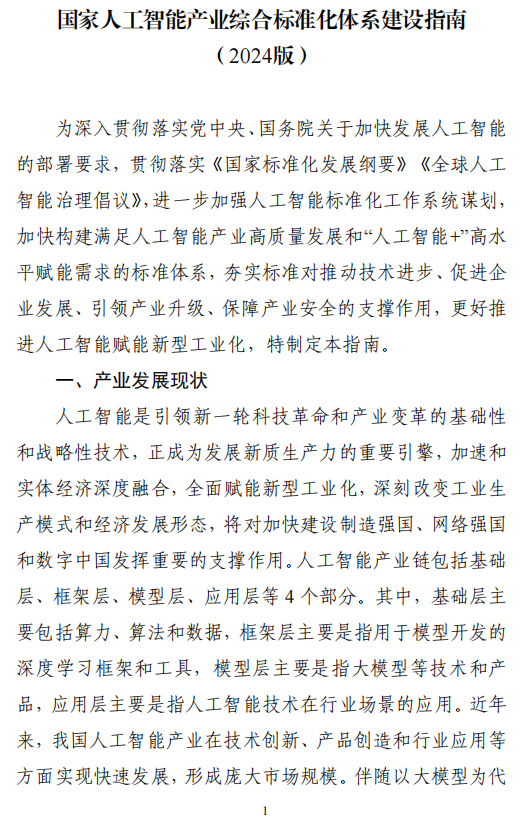 工業和信息化部 中央網絡安全和信息化委員會辦公室 國家發展和改革委員會 國家标準化管理委員會關于印發國家人工智能産業綜合标準化體系建設指南(2024版)的通知